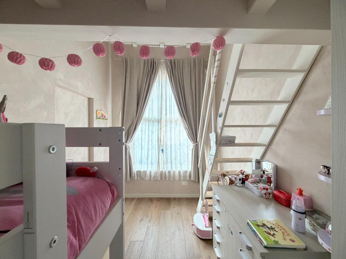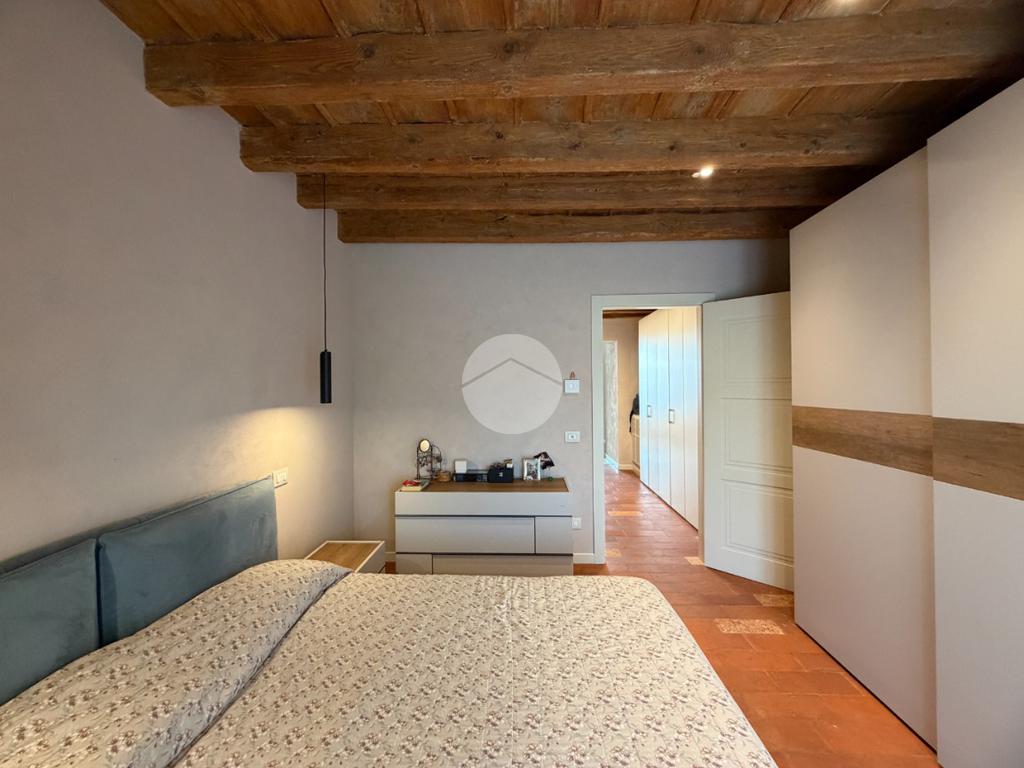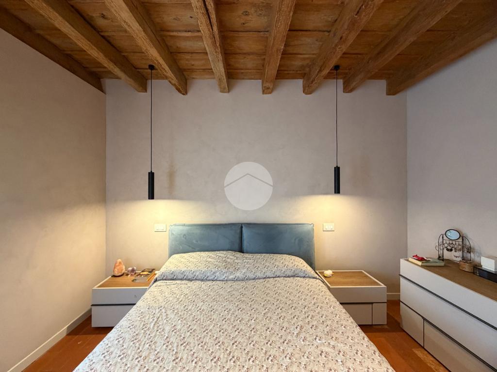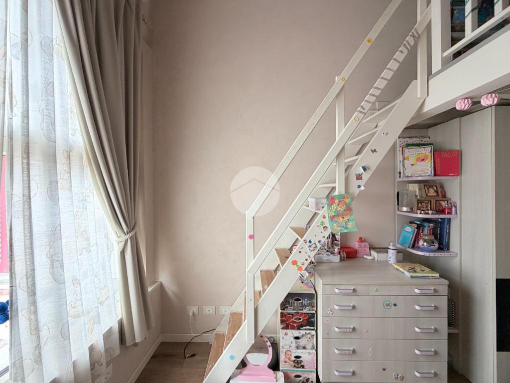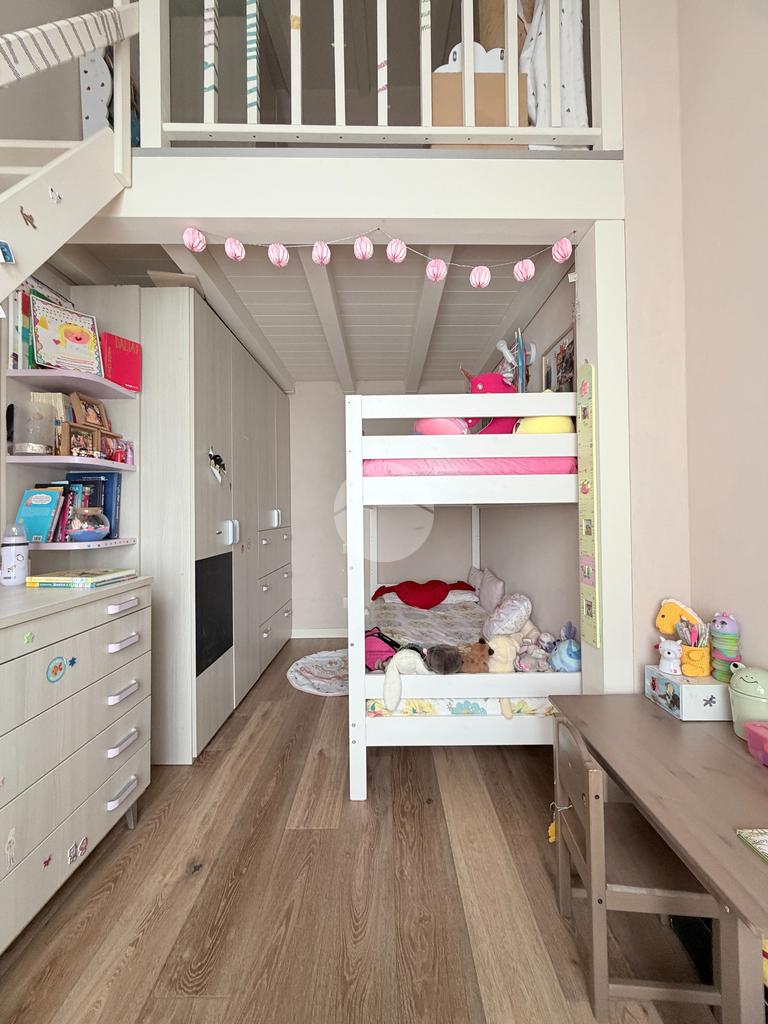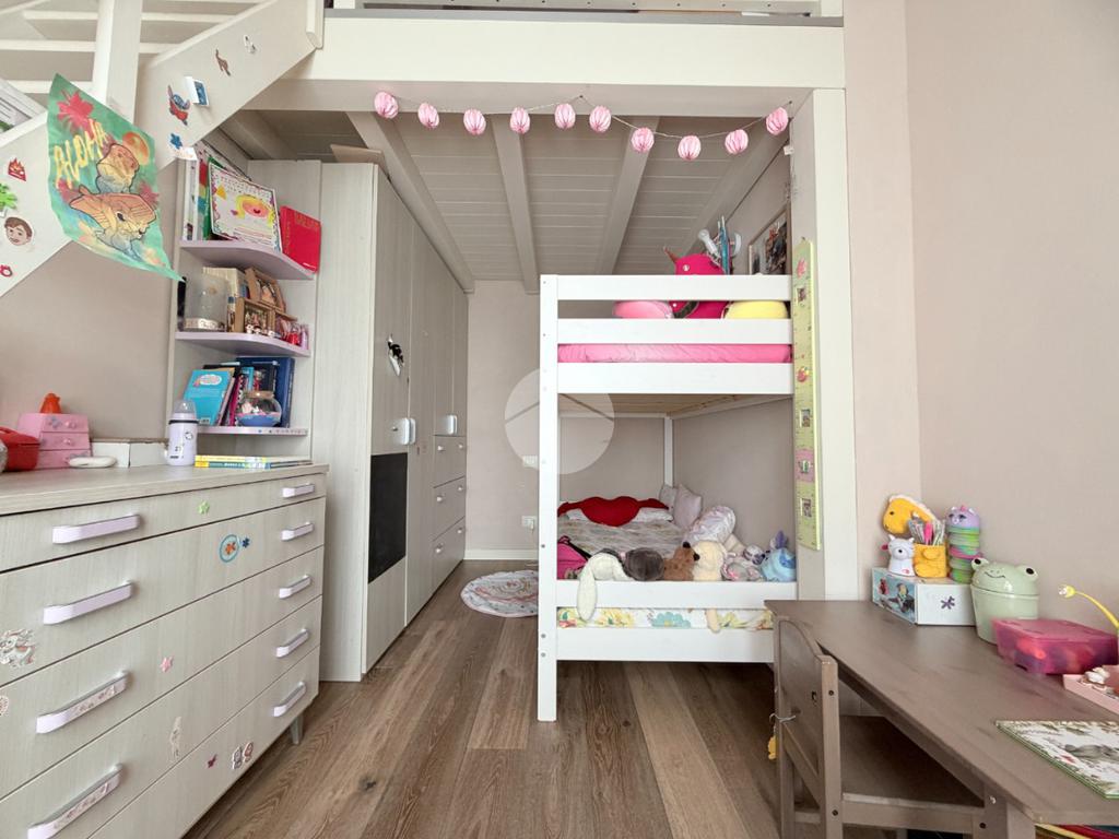Al piano primo di sviluppa la zona notte. A destra abbiamo un comodo corridoio attrezzato, dove troviamo l’ingresso al secondo bagno con doppi lavandini e grande vasca in appoggio. Proseguiamo e troviamo la camera matrimoniale con balconcino. Sia il bagno che la camera sono caratterizzate dalle travi a vista. Tornando sul pianerottolo delle scale, una porta filo muro ci immette nella seconda camera, caratterizzata da un’altezza maggiore, dove è stato possibile realizzare un pratico soppalco.