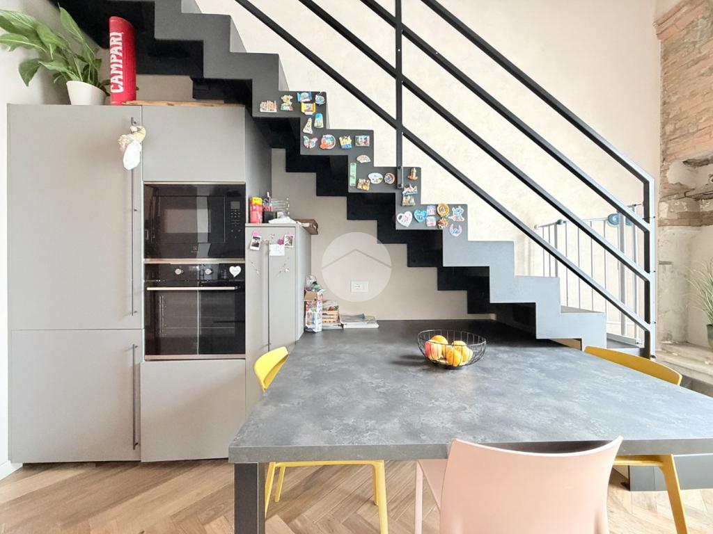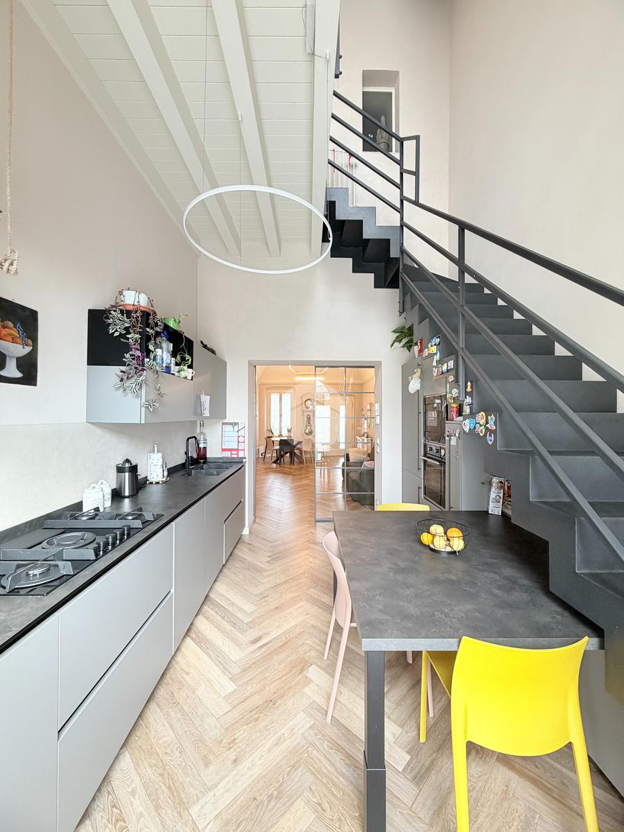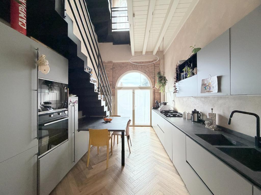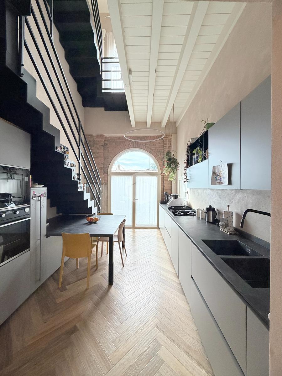 Attraversando il soggiorno accediamo alla grande cucina abitabile sviluppata su due lati. L’ambiente è separato dal soggiorno grazie ad una splendida doppia porta scorrevole in vetro e ferro, che lascia passare la luce naturale. Dalla cucina è possibile accedere al cortile interno sul quale affacciano le altre proprietà.