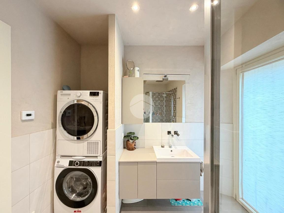Dal cortile accediamo tramite portone blindato nell’ampio soggiorno, caratterizzato dall’alto soffitto. Sulla destra troviamo un pratico disimpegno attrezzato con armadiatura a muro su misura, contenente anche il locale tecnico. Tramite esso accediamo al bagno che serve il piano, doccia con soffione ad incasso, sanitari sospesi e comodo spazio adibito a lavanderia.